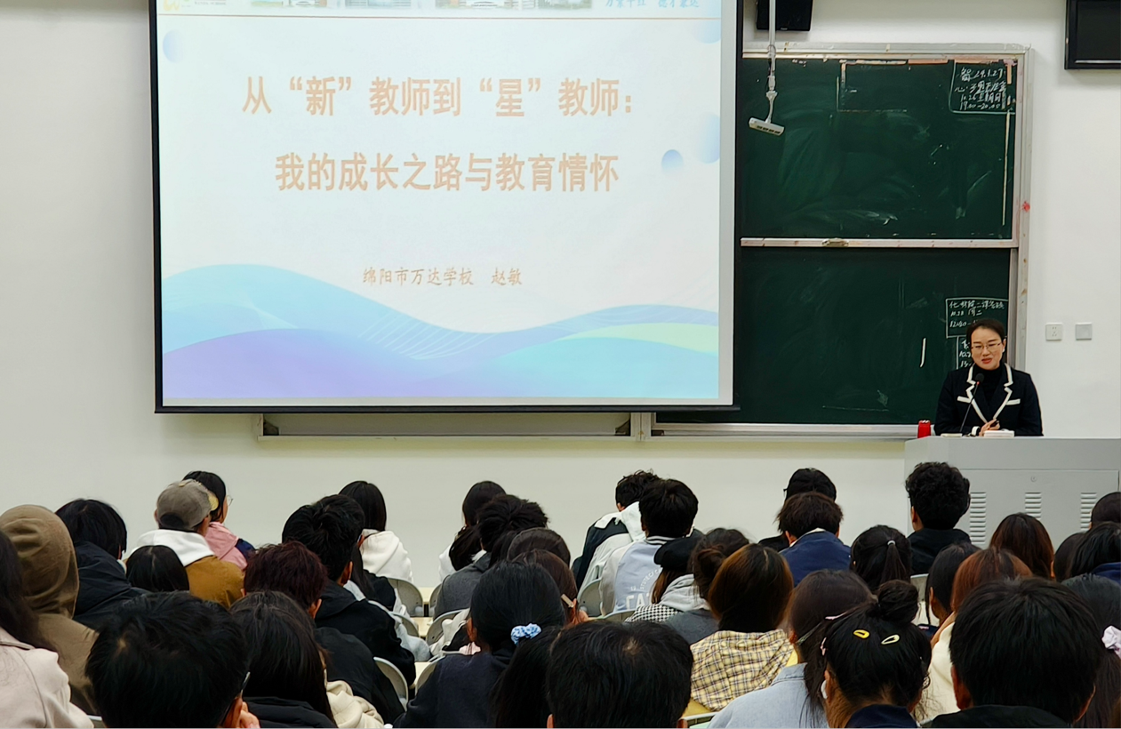 为厚植师范生教育情怀、筑牢职业信念,2025年10月23日晚,教育学院特邀小学教育专业优秀校友、绵阳市万达学校学术委员会主任、四川省“四有”好老师赵敏重返母校,在游仙校区三教114教室为师生带来题为《从“新”教师到“星”教师:我的成长之路与教育情怀》的专题讲座。本次活动由教育学院副院长蔡文君主持,小学教育专业部分教师及2025级全体学生共同参与。